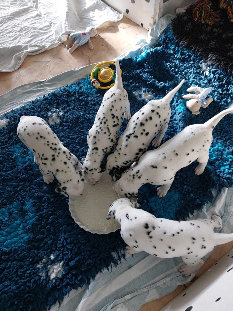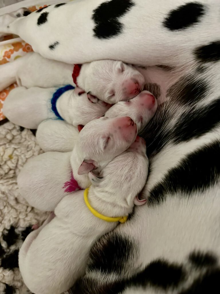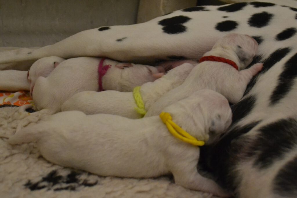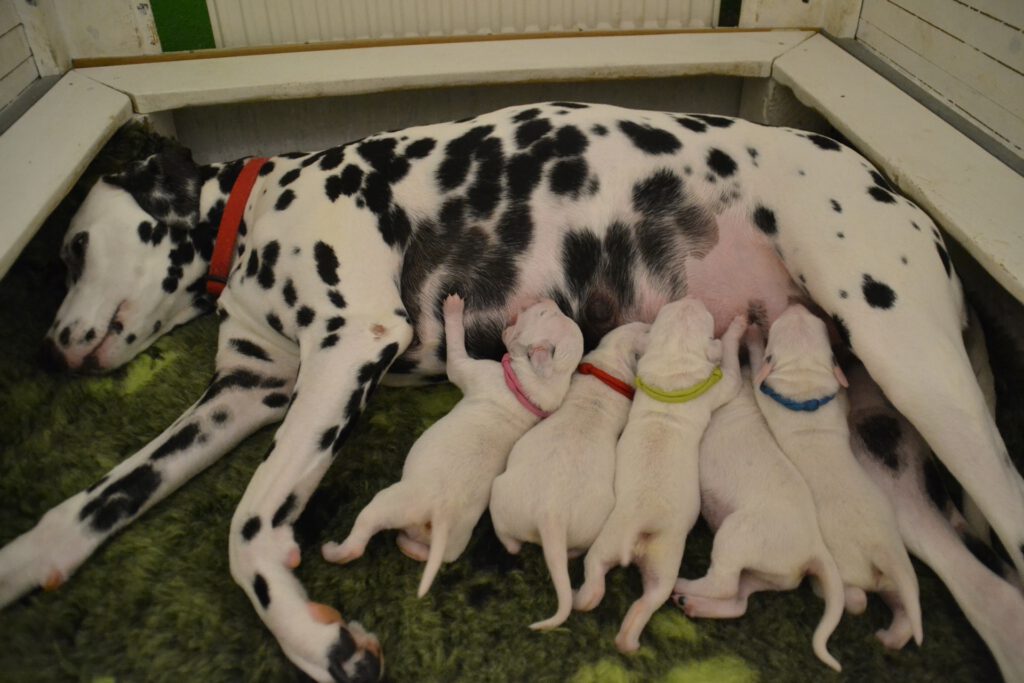 Alle 5 Welpen waren nach einer Minute bereit, ihr erstes Mal an der Milchbar einzunehmen und hatten nach 5 Minuten deutlich dickere Bäuchlein. Seither nehmen sie kontinuierlich zu und machen uns einfach nur Freude.