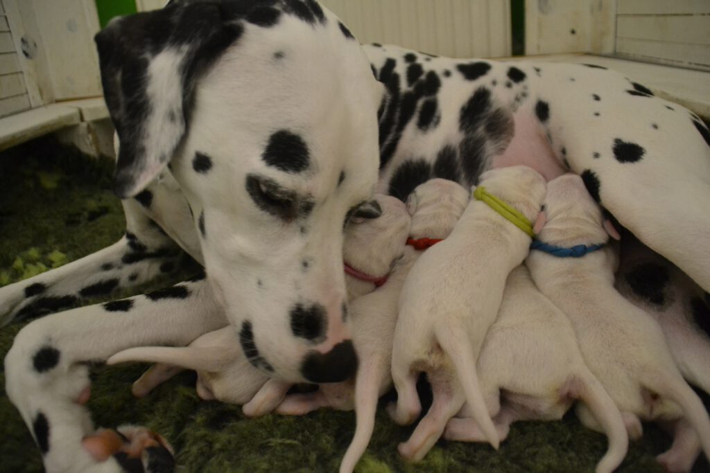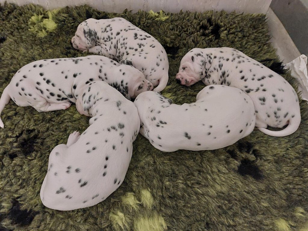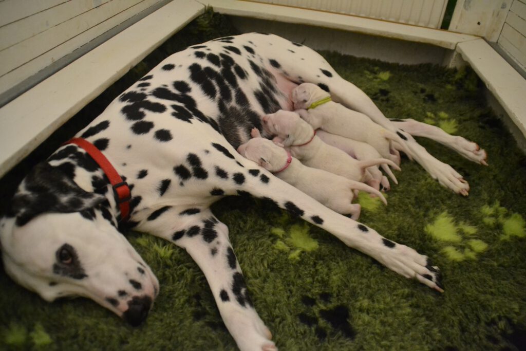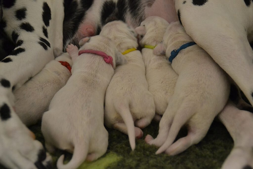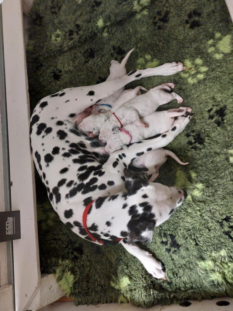 Alle 5 Welpen waren nach einer Minute bereit, ihr erstes Mal an der Milchbar einzunehmen und hatten nach 5 Minuten deutlich dickere Bäuchlein. Seither nehmen sie kontinuierlich zu und machen uns einfach nur Freude.