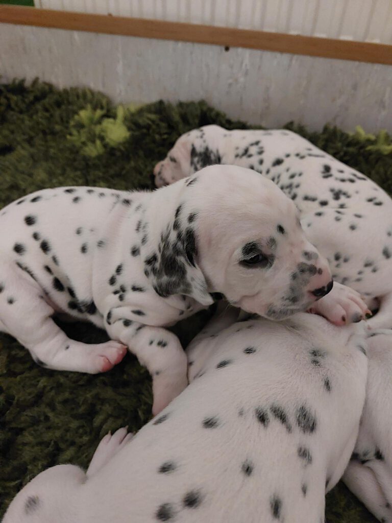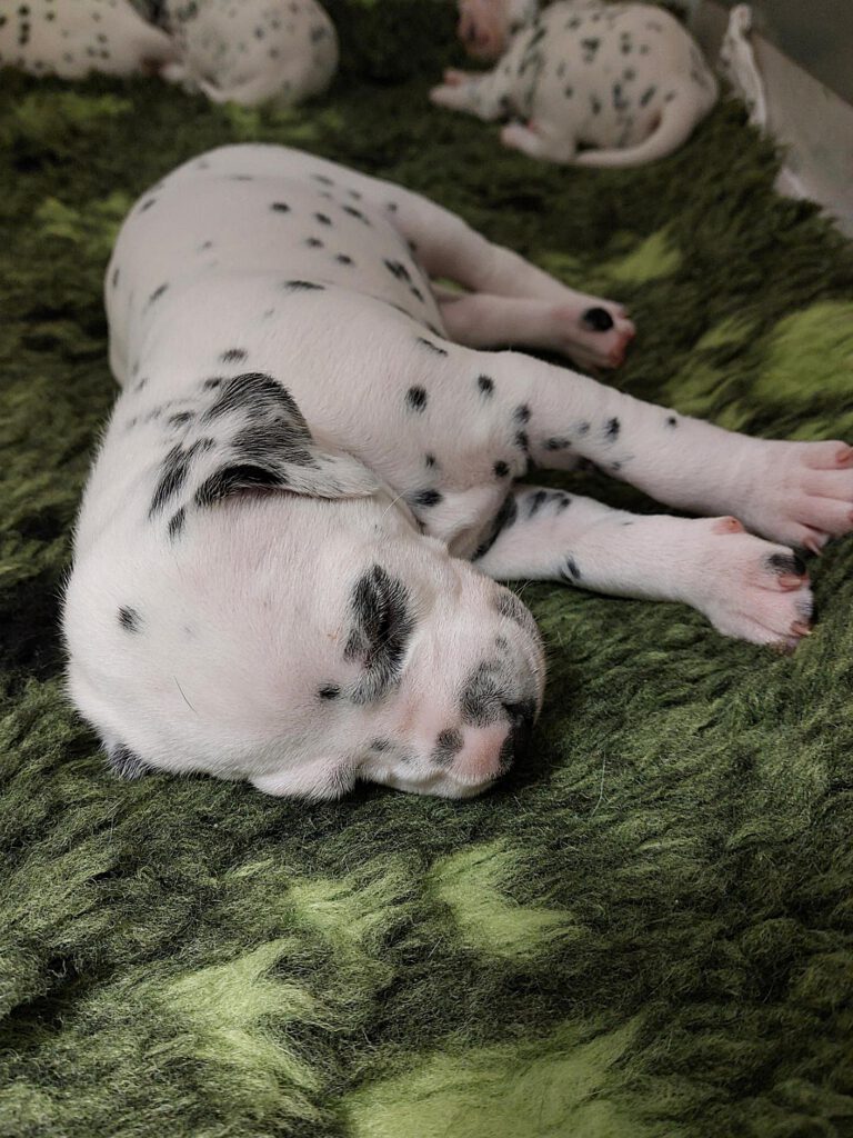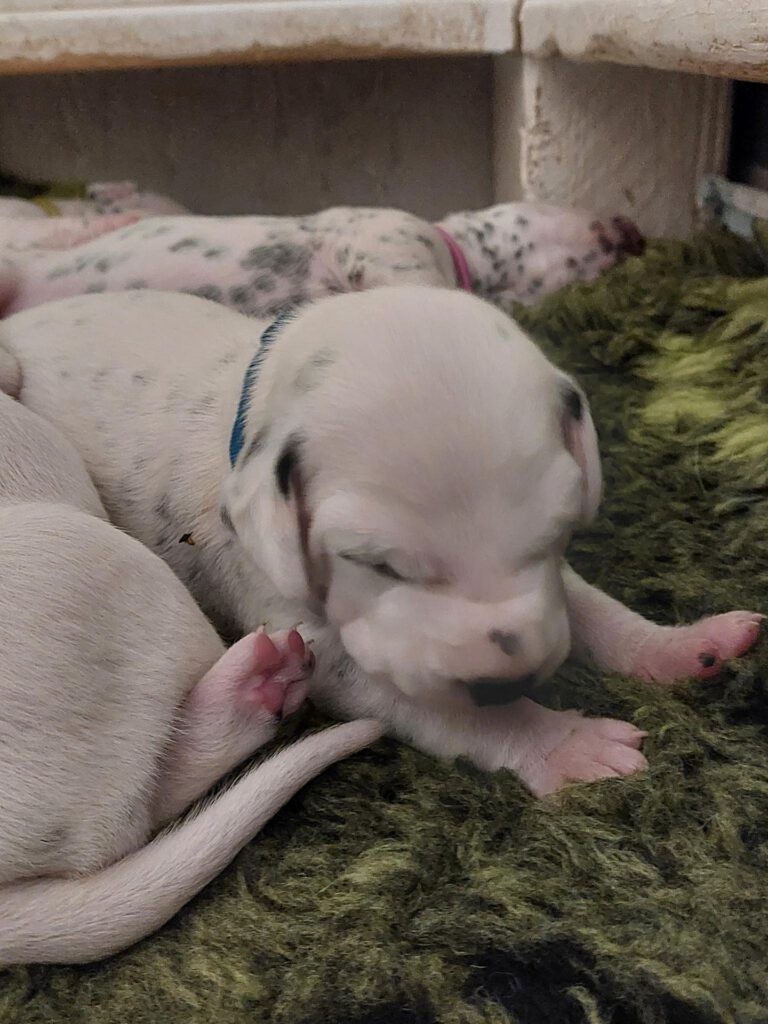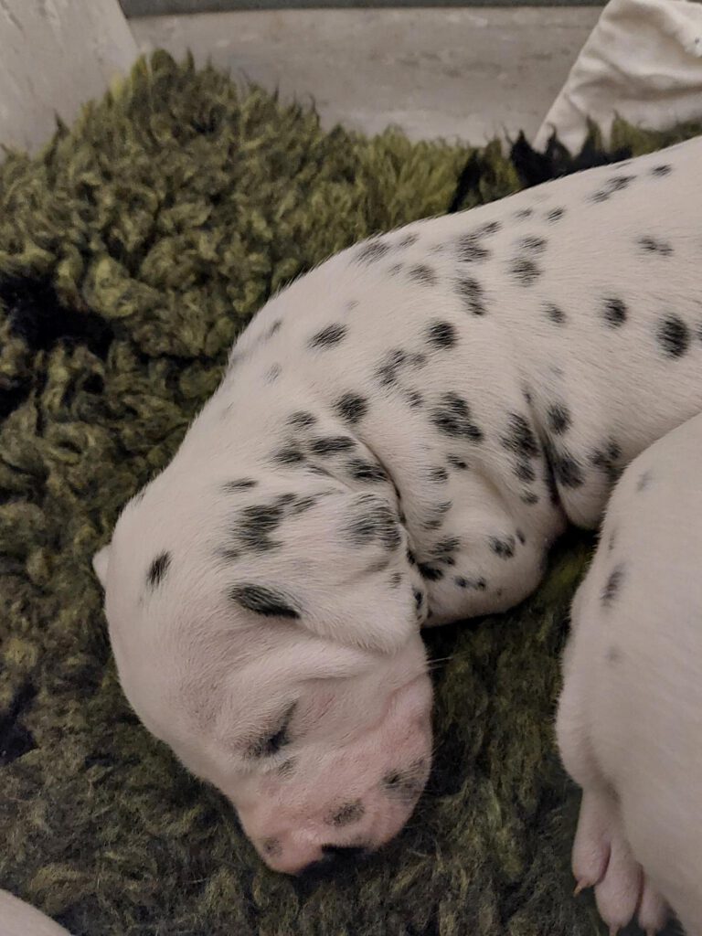 Die Fleckung kommt langsam durch und aus weißen Mäusen, werden echte Dalmis. Die kleinen haben einen enormen Appetit und am 11.Tag beginnen sie die Augen zu öffnen.