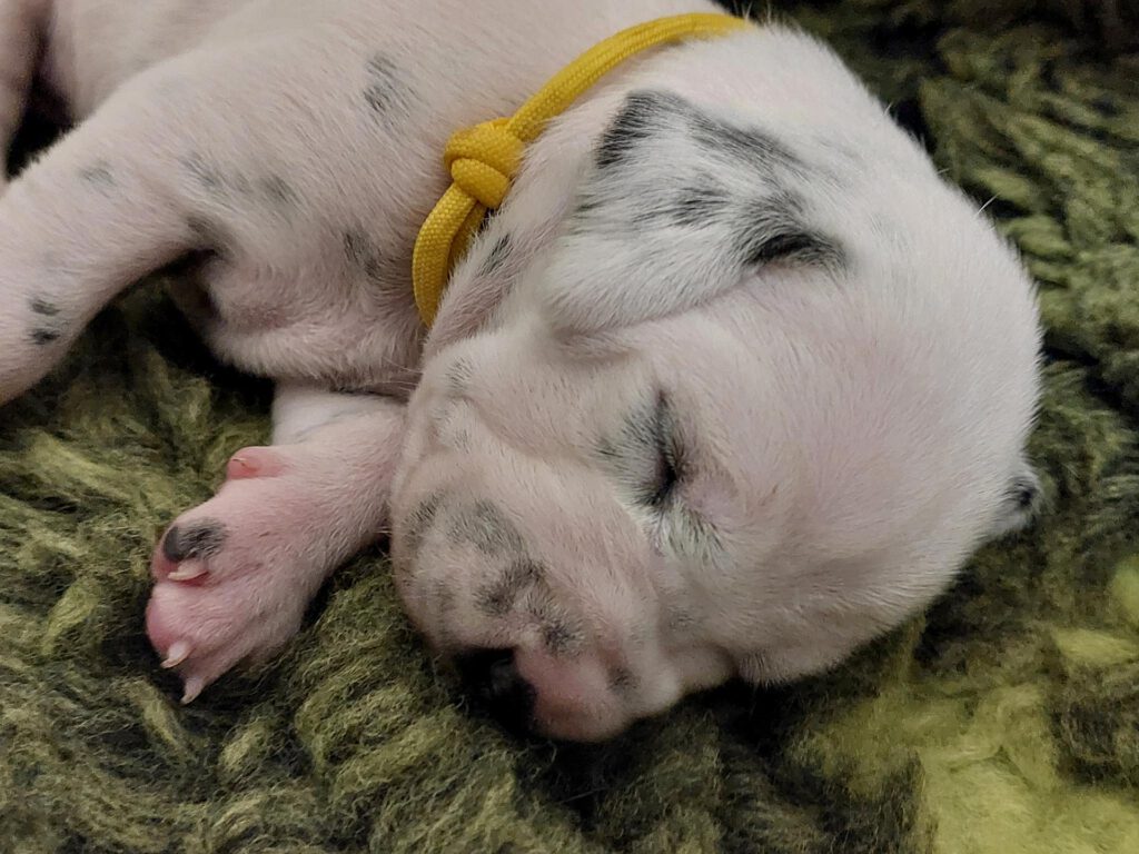4. Welpe Hündin, 12.30 Uhr, 505 Gramm,. Bändchenfarbe Gelb, Biotonus 1+