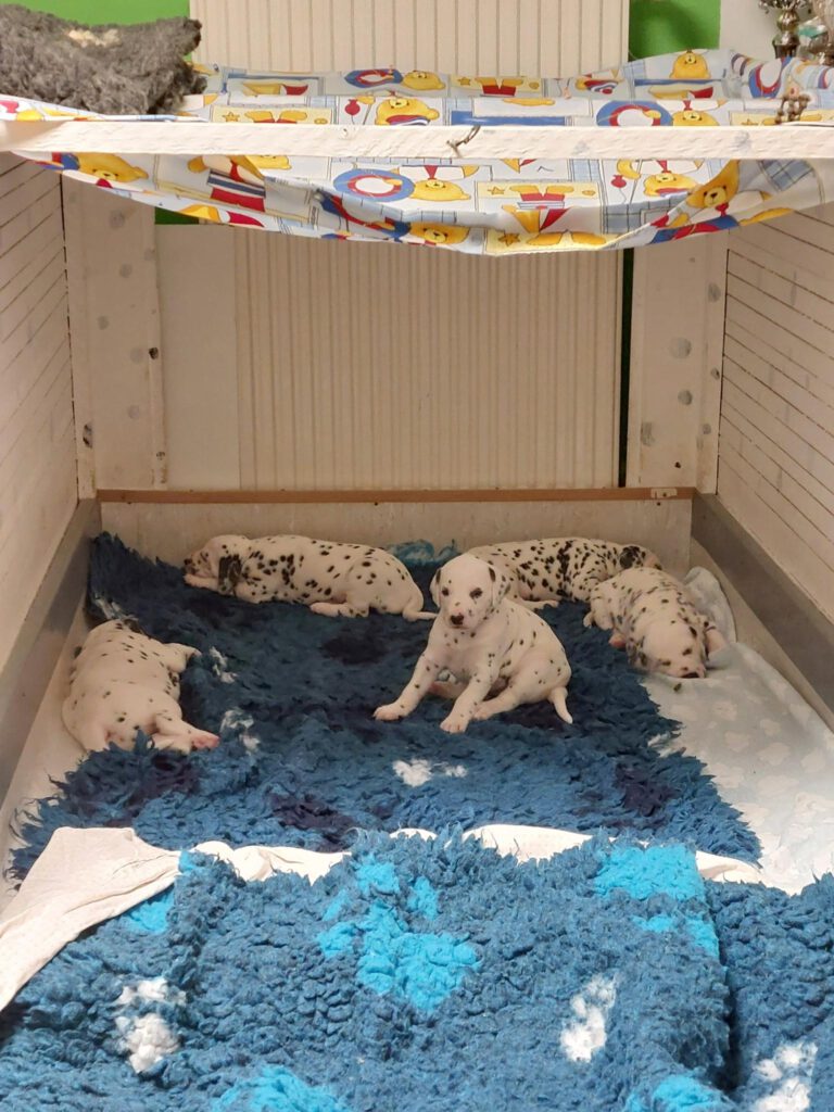 Nun geht es mit Riesenschritten voran. Sie schlafen zwar noch viel, aber die Augen und die Ohren sind geöffnet und damit nehmen die Welpen ihre Umwelt nicht mehr nur über den Geruchsinn wahr. Es ist so schön, wenn man zu den Kleinen in die Wurfkiste krabbelt und die kleinen Schwänzchen wedeln schon, weil man erkannt wurde. auch ein kurzes Spielchen mit den Geschwistern lässt sich mittlerweile erkennen. Phoebe macht ihre Sache so gut. Eine bessere Mama kann sich die kleine Bande nicht wünschen.