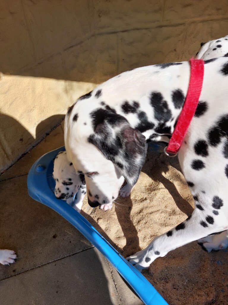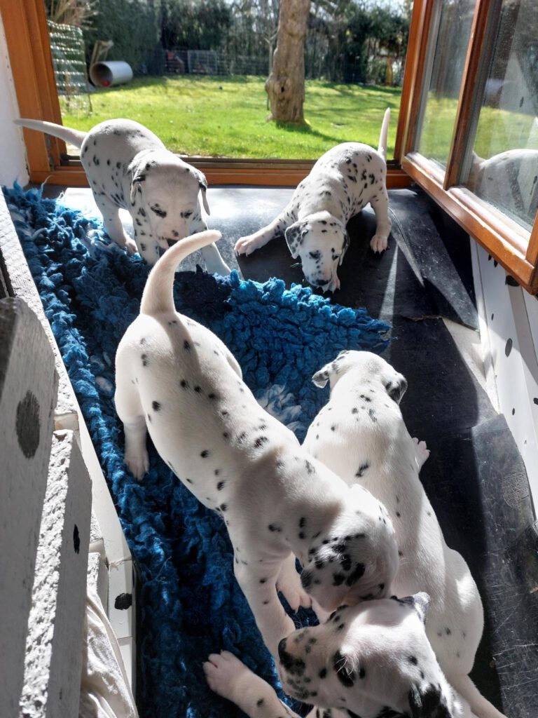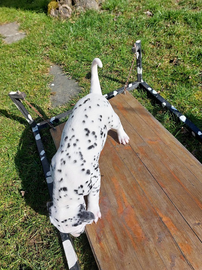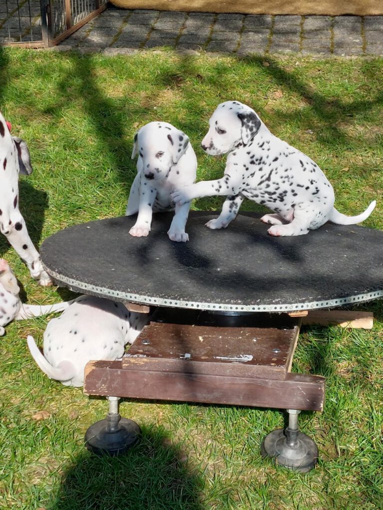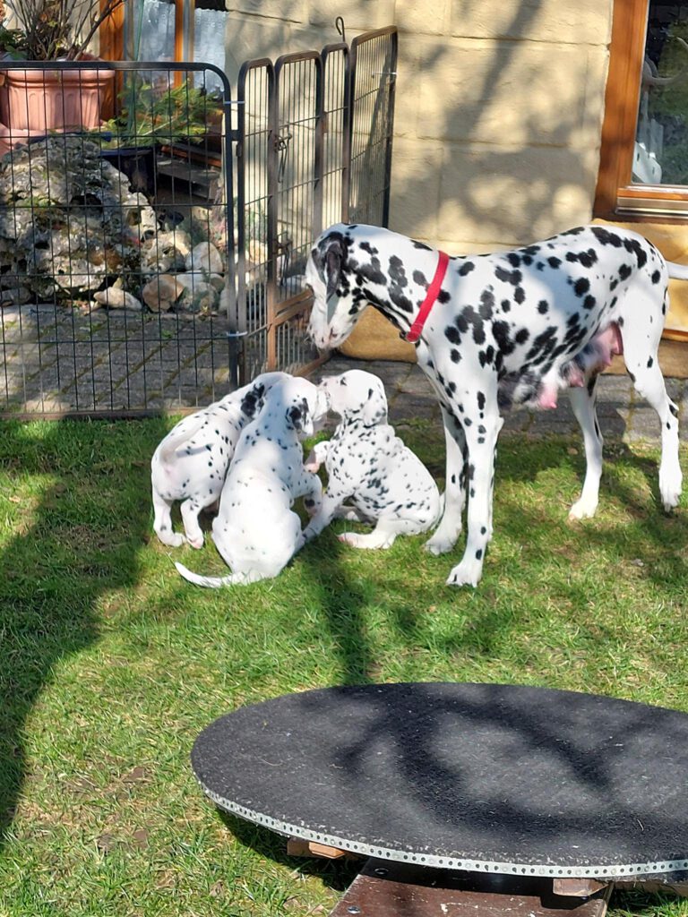 Man kann gar nicht glauben, wie schnell sich die kleine Bande entwickelt. Es ist so schön, sie zu beobachten, wie sie ihre neue Welt erkunden. Unsere Spielgeräte, wie das Wackelbrett, die Drehscheibe, Tunnel und Wippe werden mit einer Selbstverständlichkeit angenommen, die mich immer wieder erstaunt. Herr Petrus verwöhnt uns zudem mit herrlichem Sonnenschein, so dass sich die Kleinen im großen Welpengehege so richtig austoben und Muskeln bekommen können. Oma Leia darf jetzt auch schon mit dazu und erzieht mit. Phoebe ist sichtlich stolz auf ihre unerschrockenen Kinder.